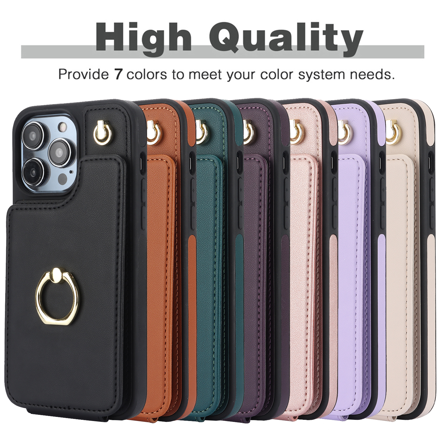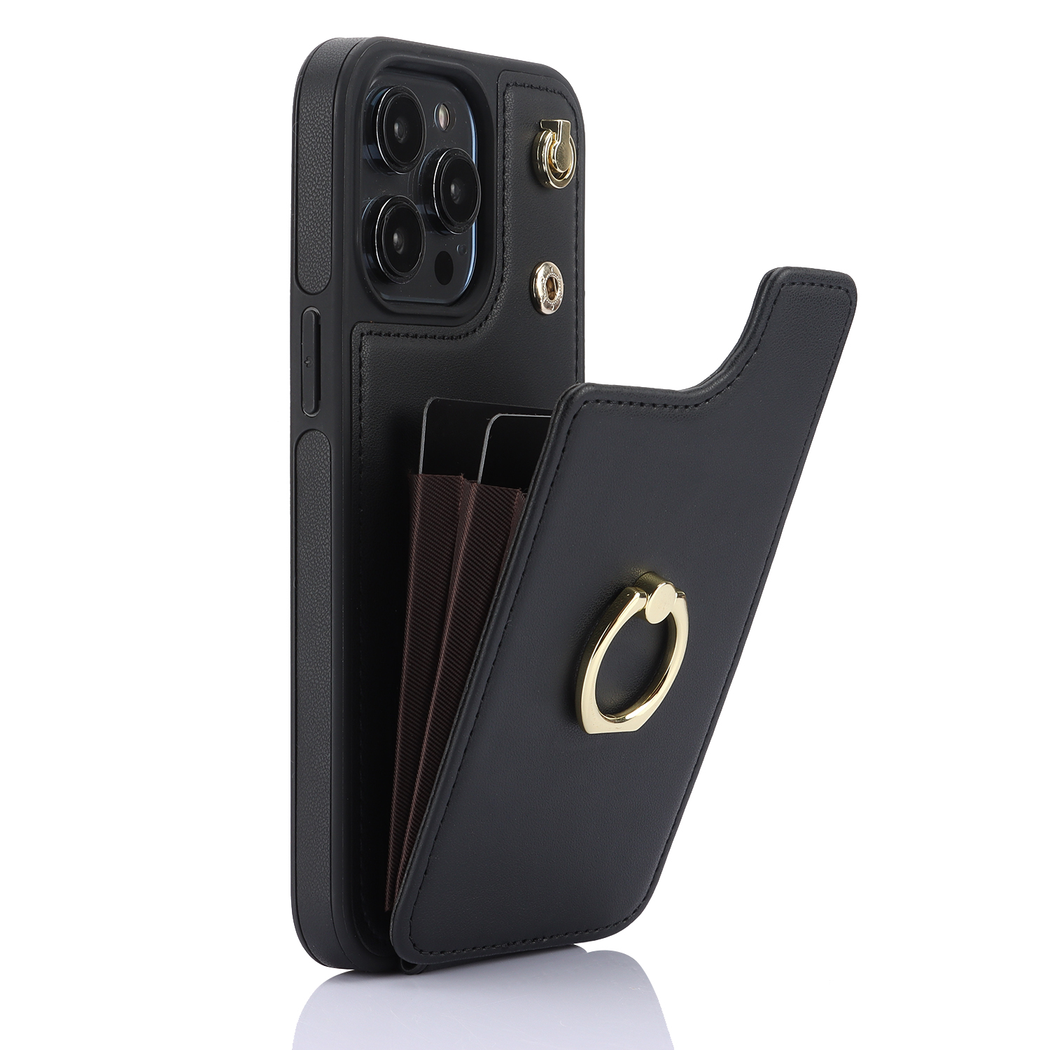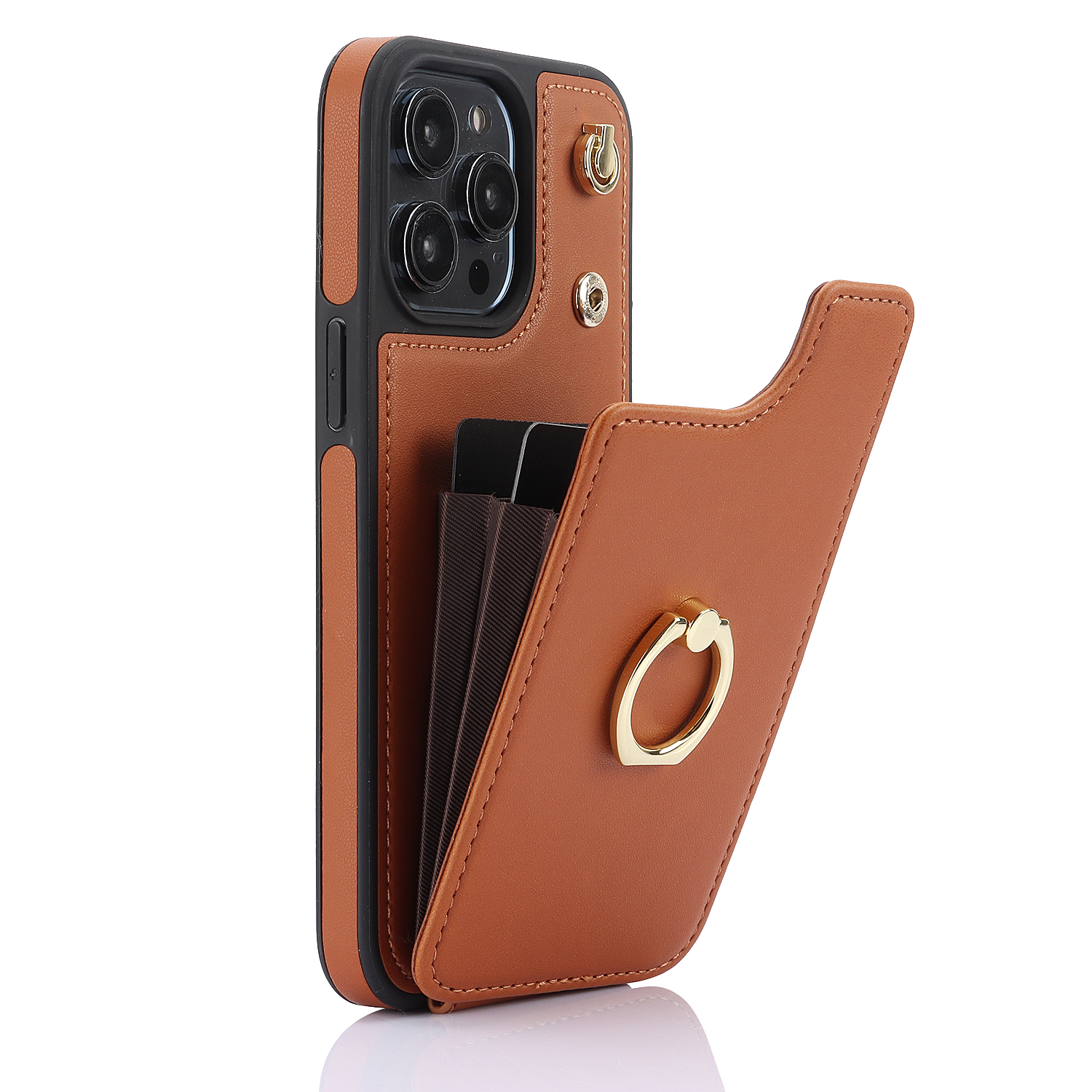 Crossbody Shockproof Leather Card Holder Wallet Case for iPhone 15 Pro, 14, 13, 12, 11, XR, XS, Ring Kickstand Protective Cover