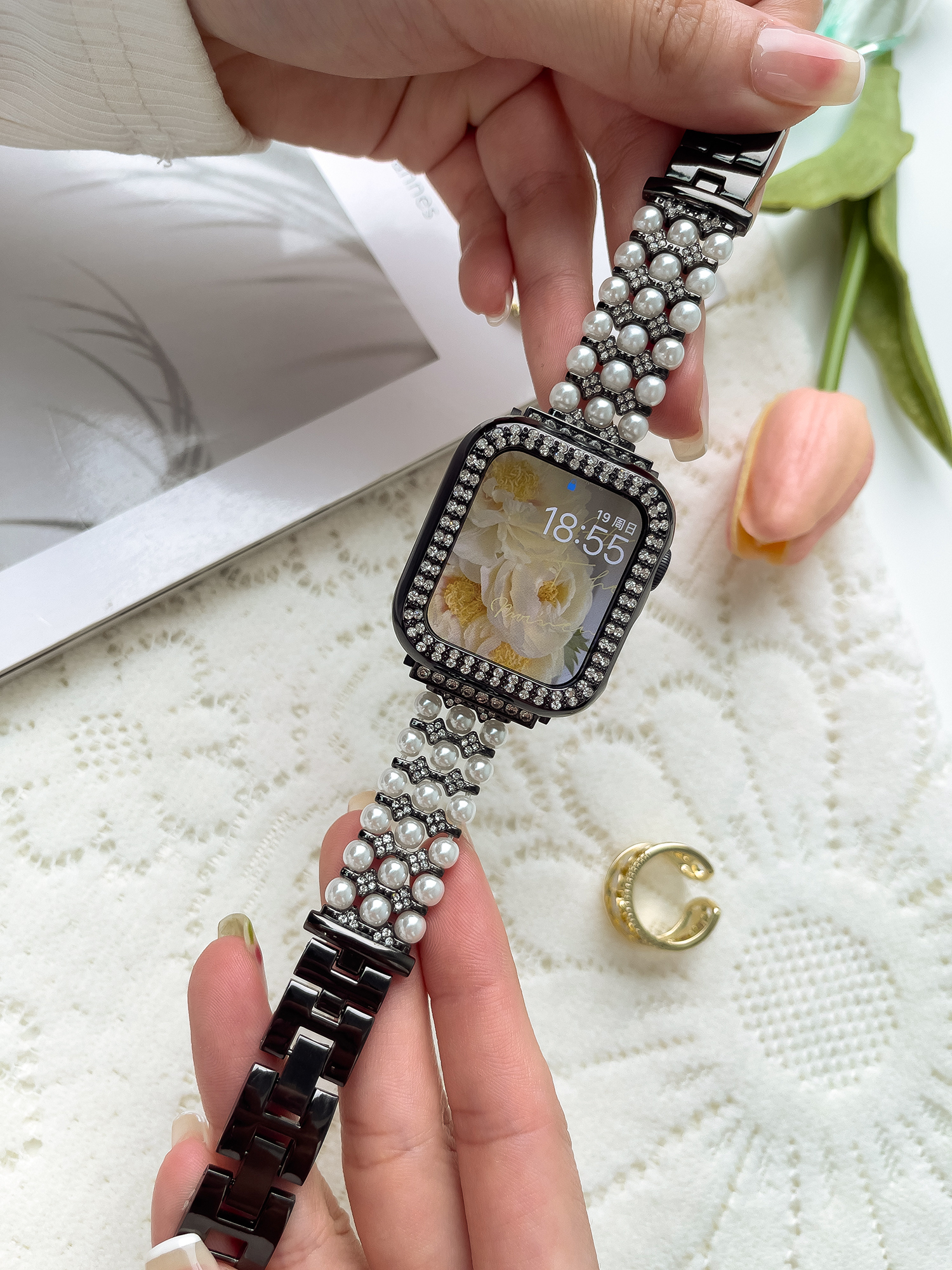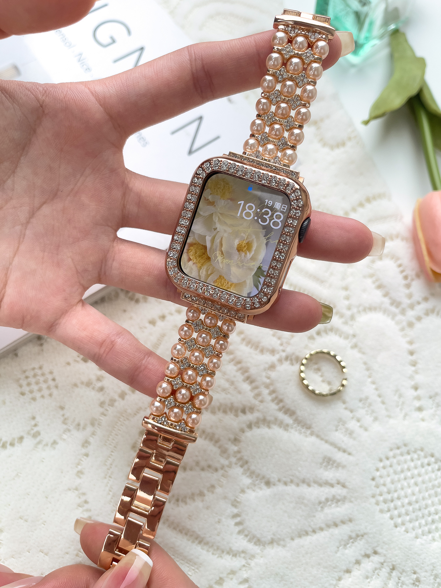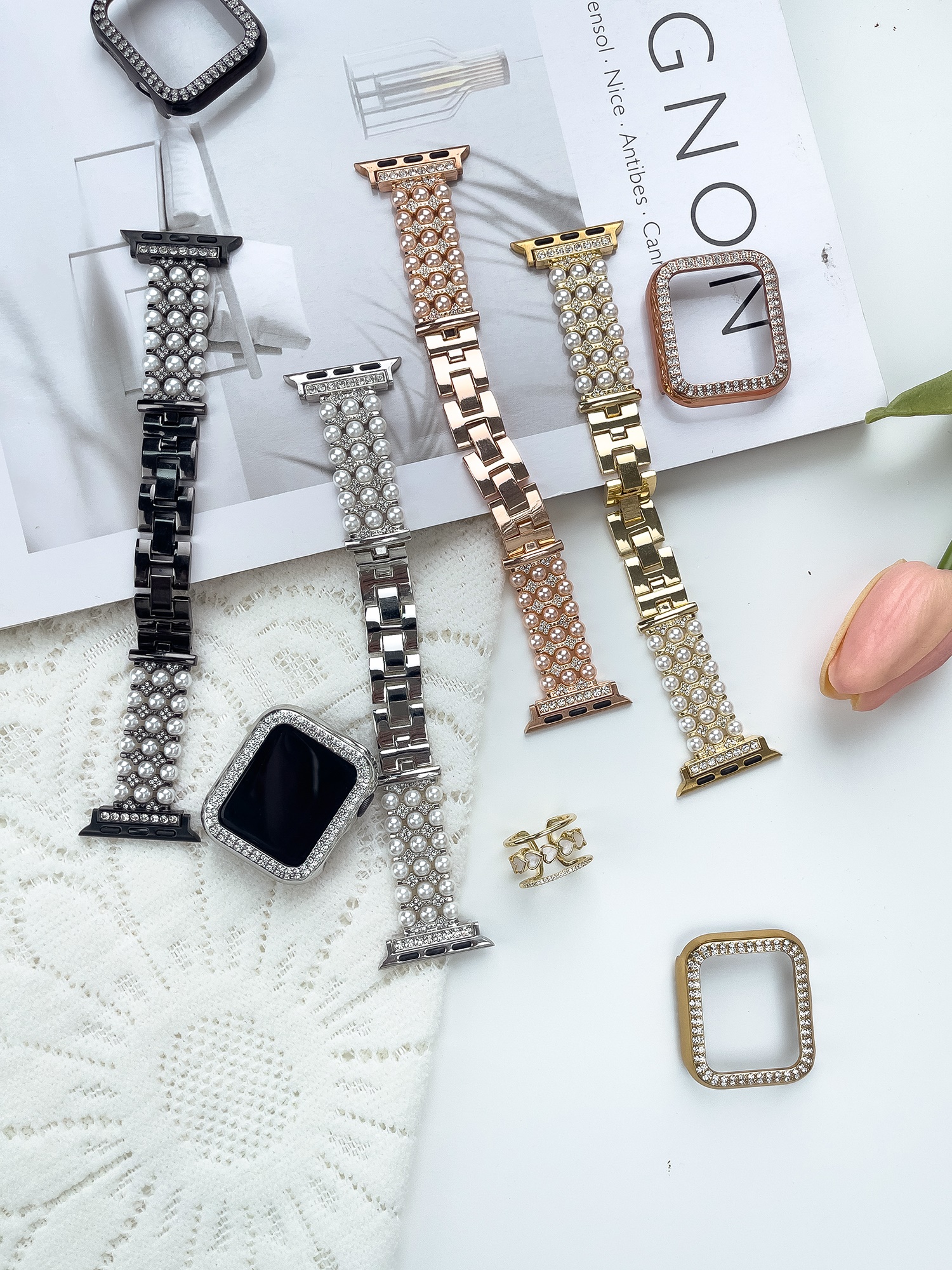 For Apple Watch Bands 49mm 45mm 41mm 40mm 44mm Women Pearl Metal Strap Diamond Protective Case for iWatch Ultra 8 7 6 5 4 3 SE