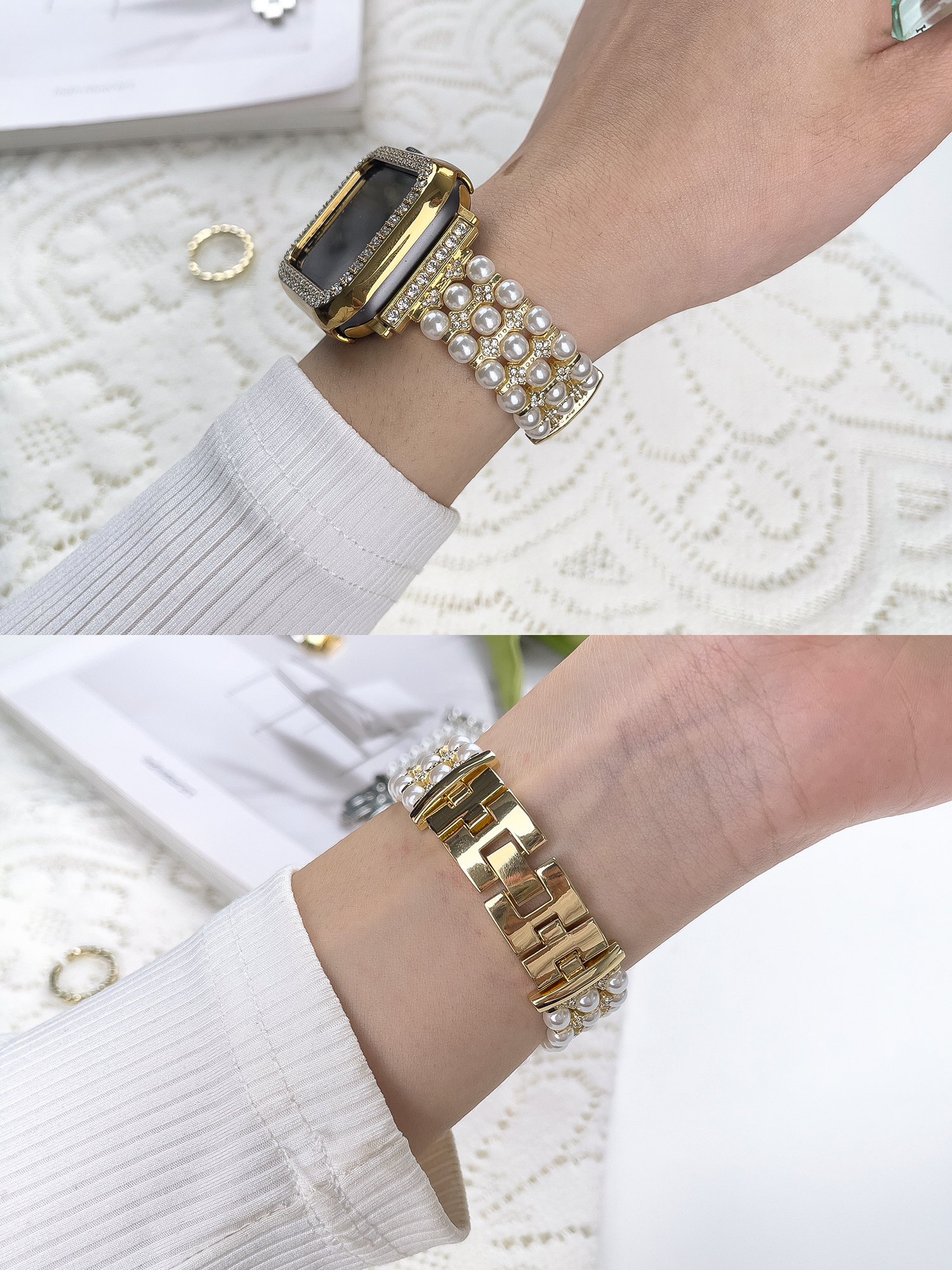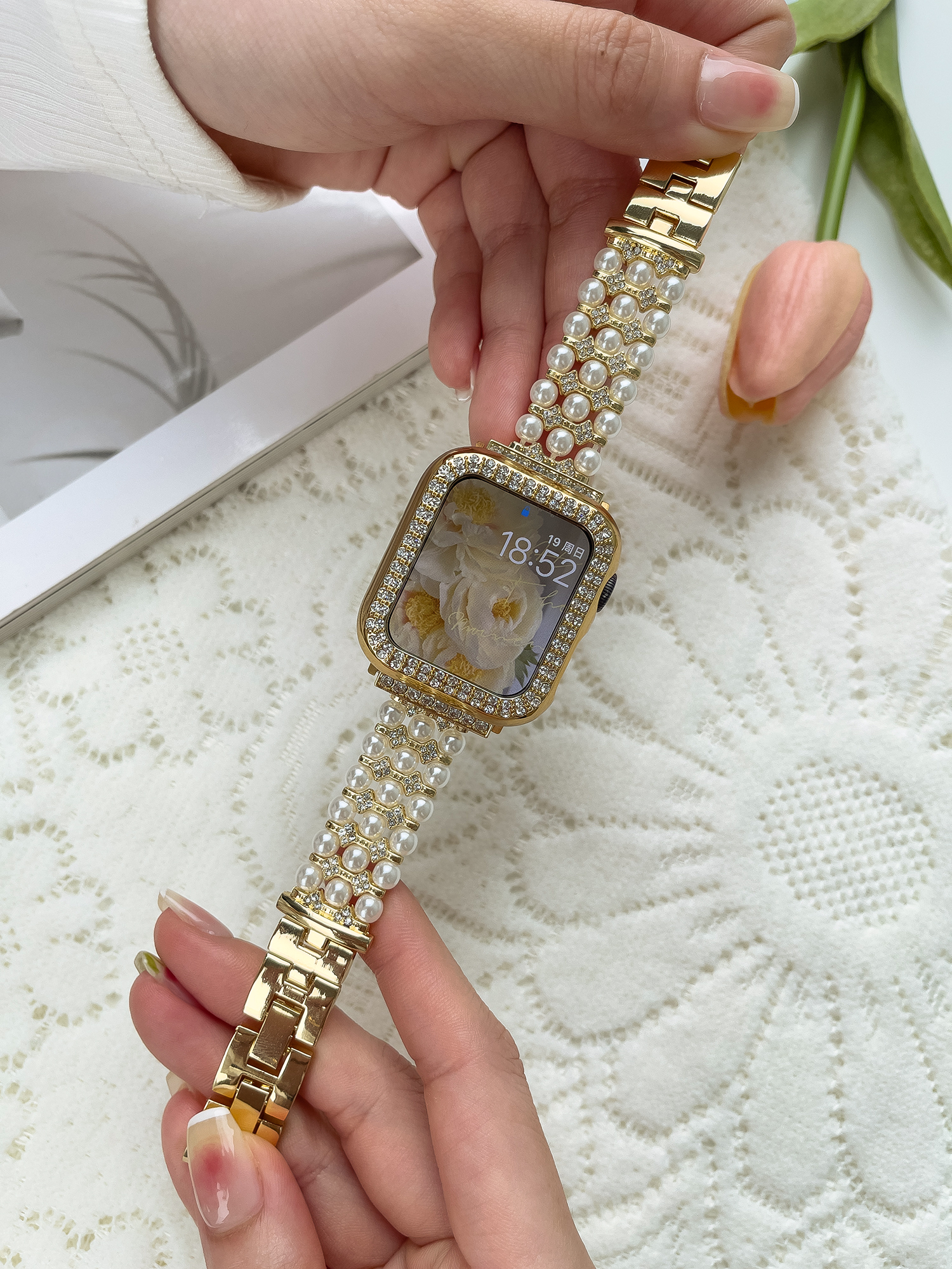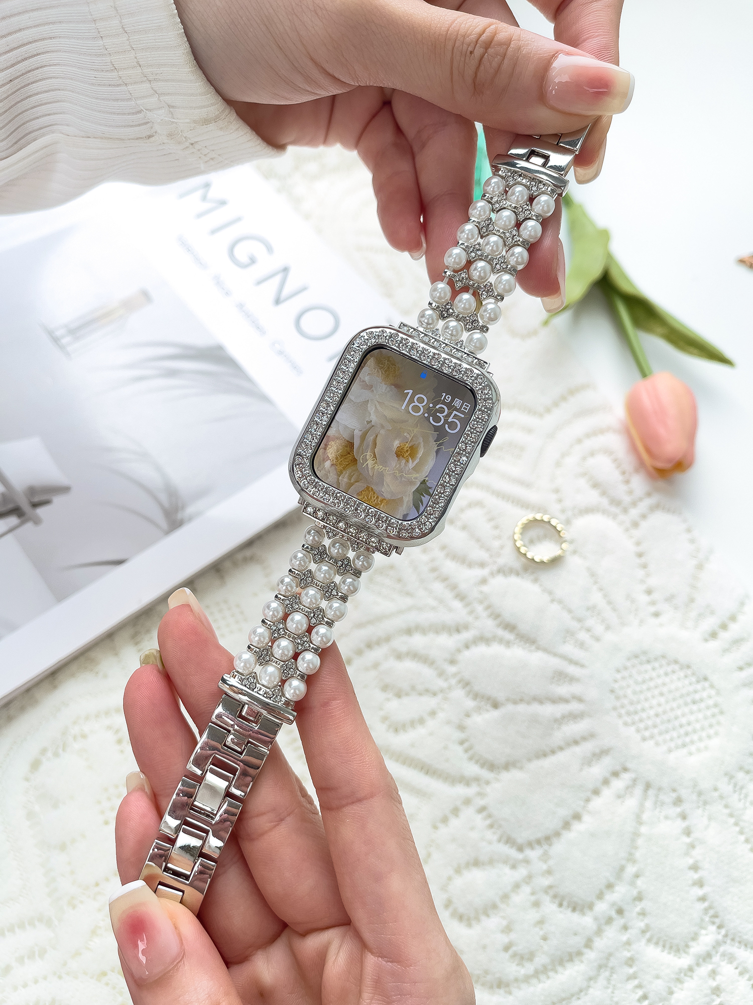 For Apple Watch Bands 49mm 45mm 41mm 40mm 44mm Women Pearl Metal Strap Diamond Protective Case for iWatch Ultra 8 7 6 5 4 3 SE