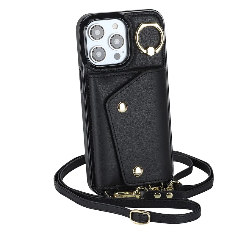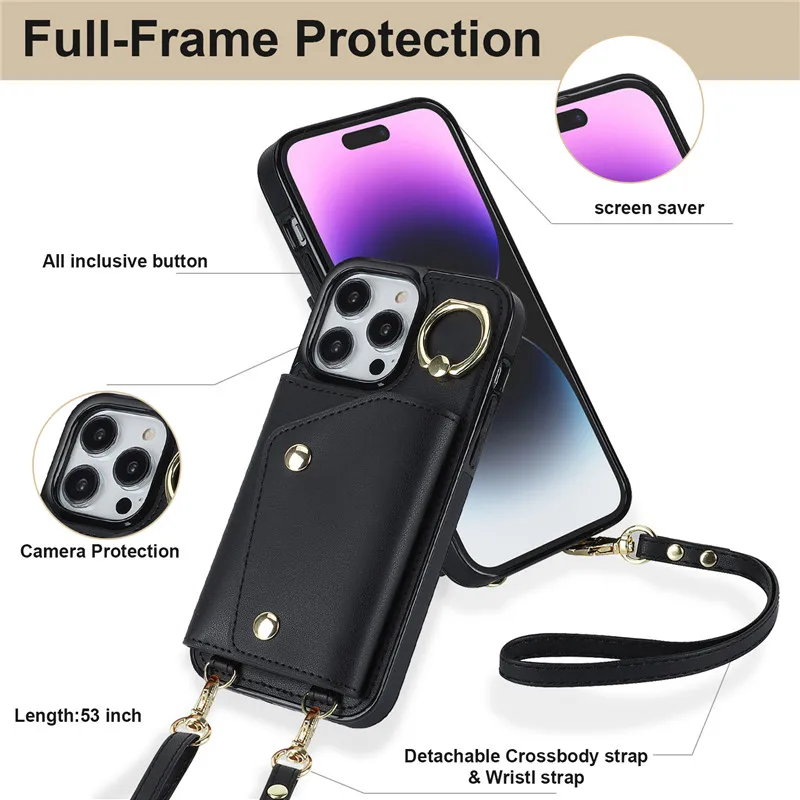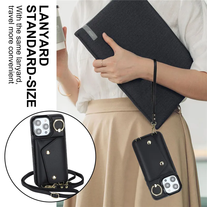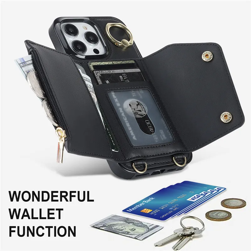 Lanyard Leather Zip Wallet Card Phone Case for iPhone 15 Pro Max 14 Plus 13 Mini 12 11 X XR XS SE 2022 8 7 Ring Flip Stand Cover