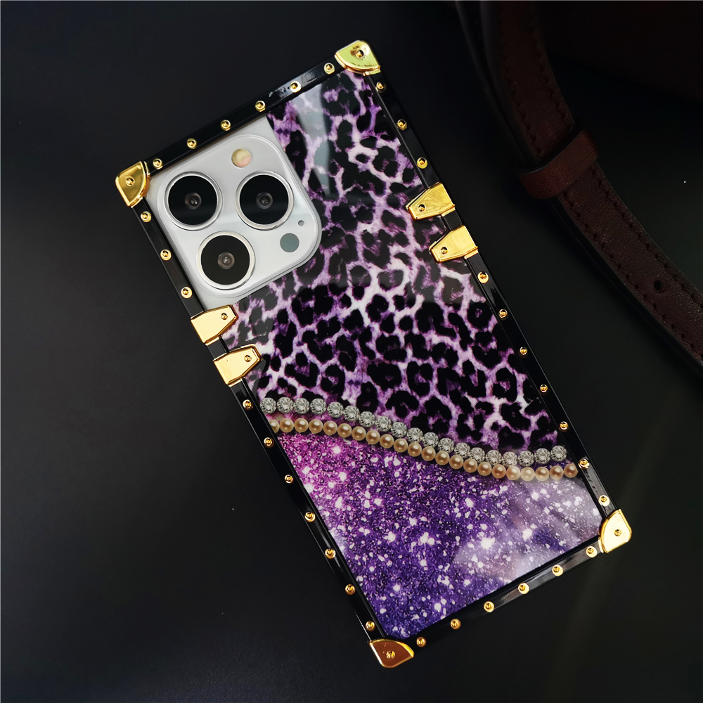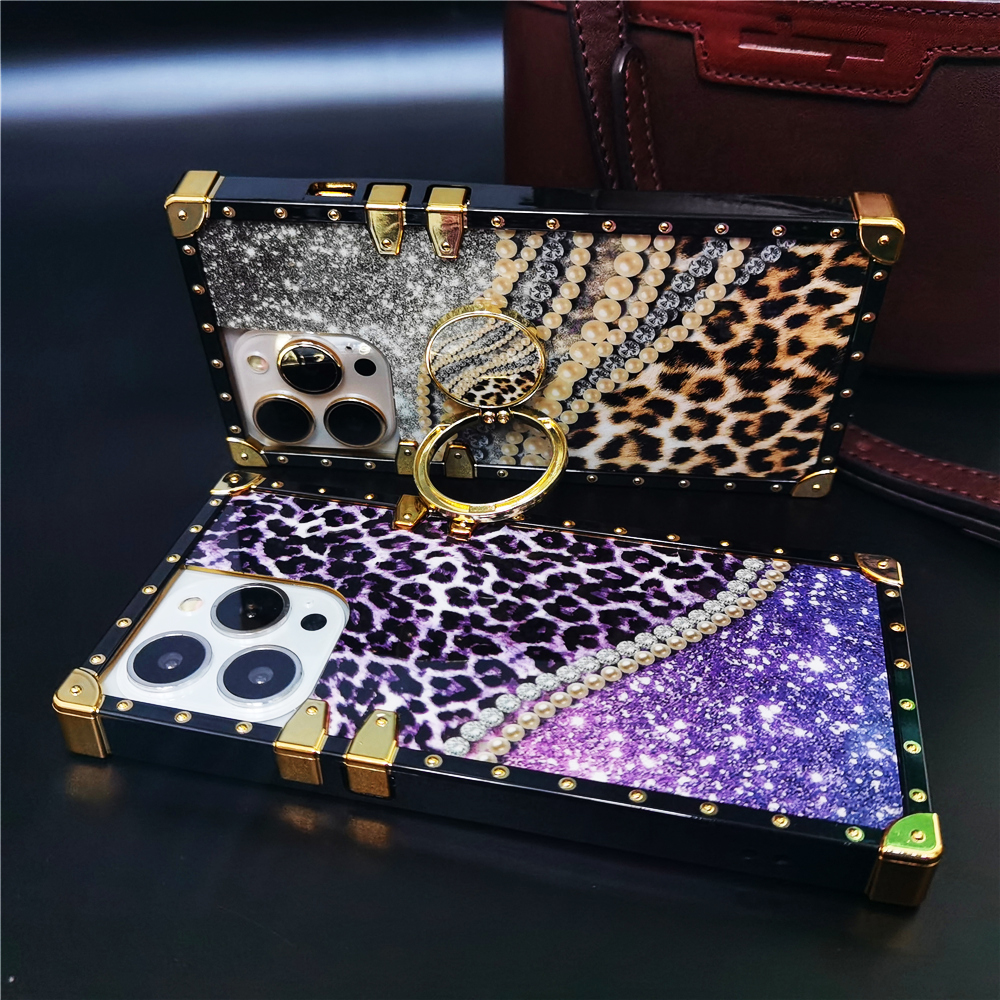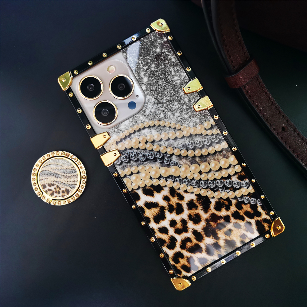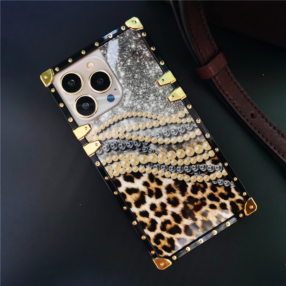 Luxury Bling Diamonds Pearl Leopard Cover For iphone 17 Air 16 15 PRO 14 PRO MAX 11 12 PRO XS XR 8 Square Phone Case For iphone 13 PRO MAX