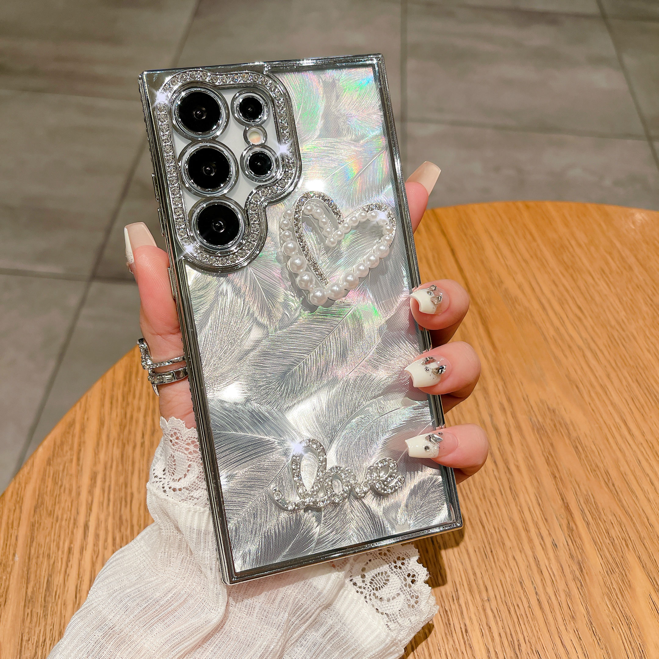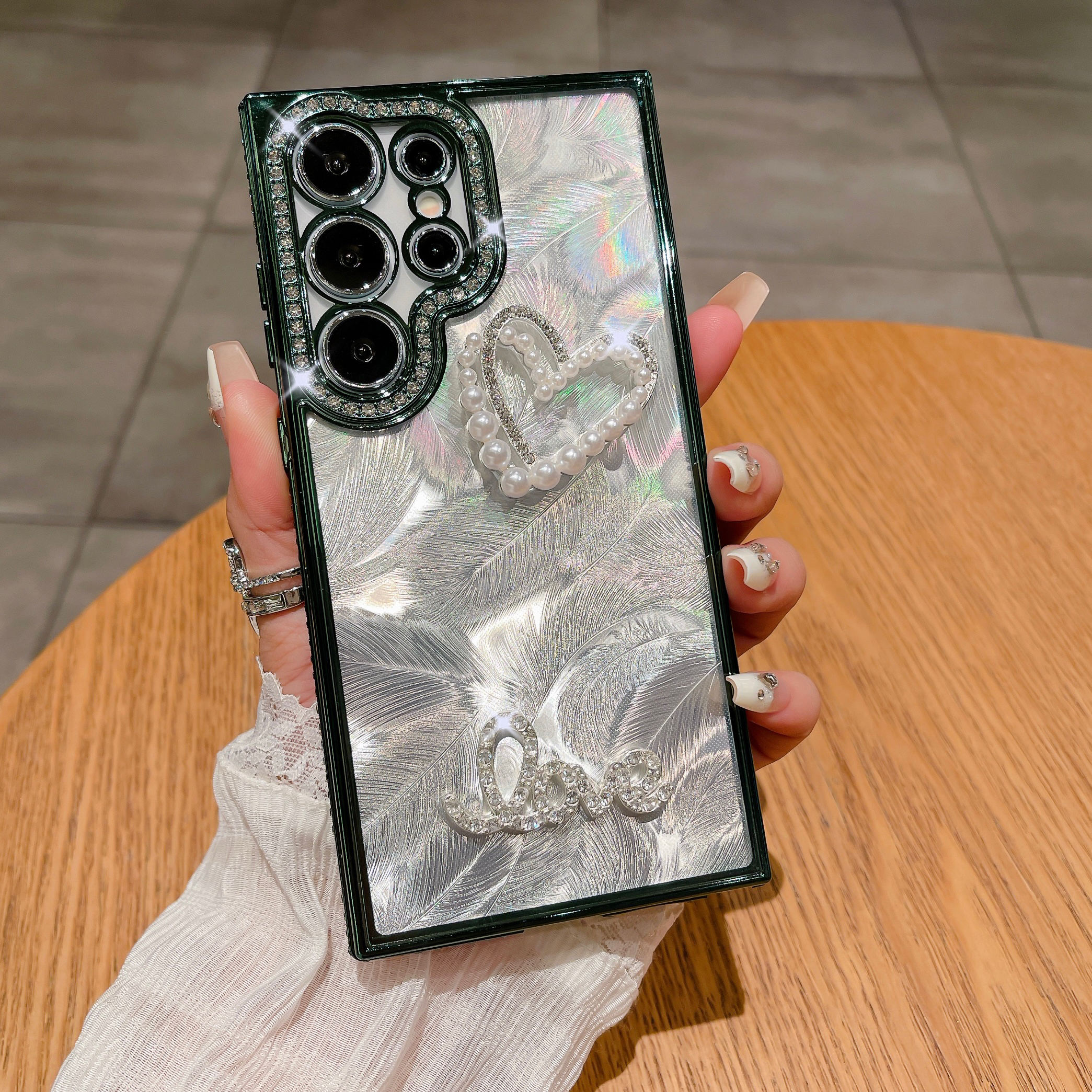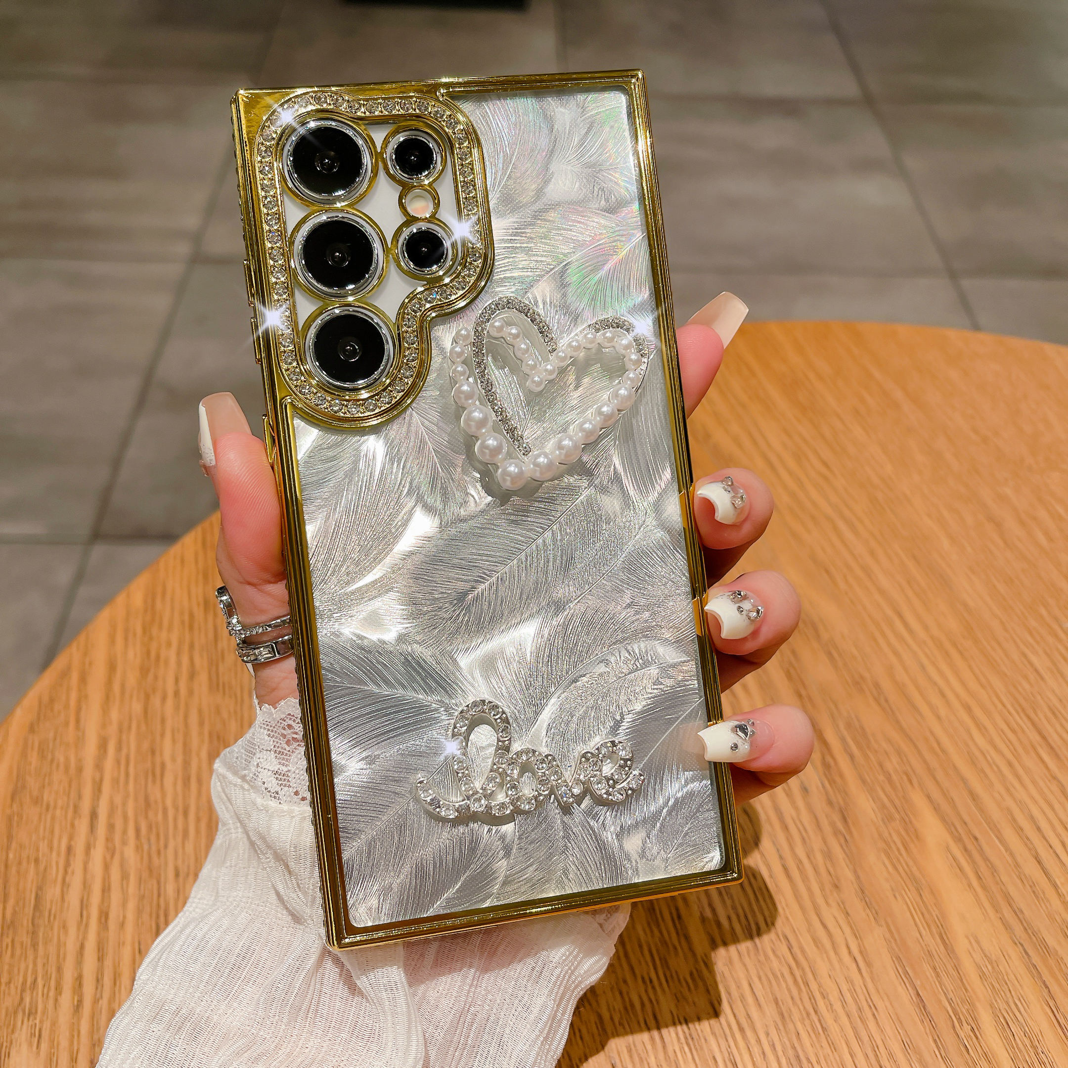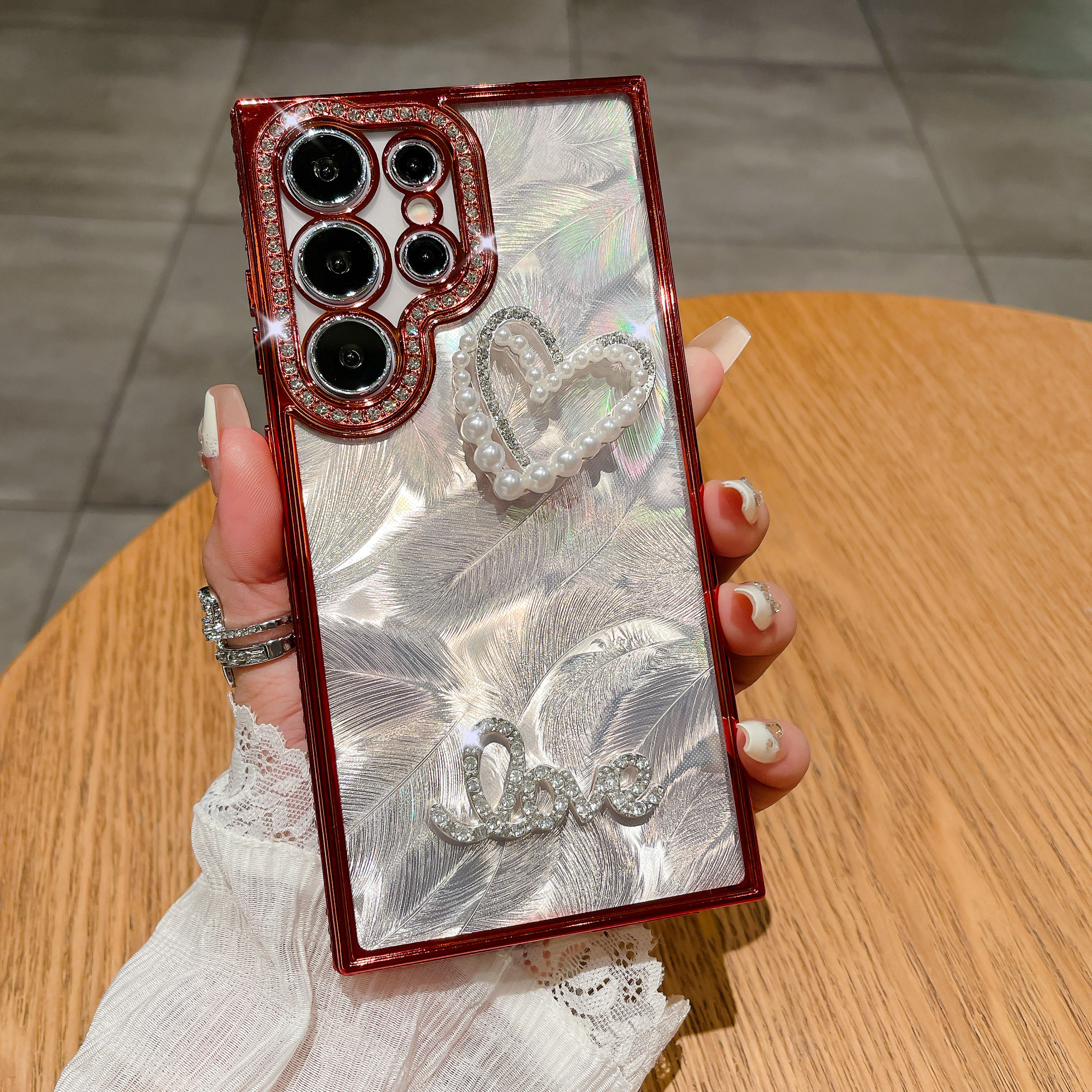 Luxury Electroplated Glitter Diamond Pearl Heart Case for Samsung Galaxy S22 S23 S24 Ultra Plating Edges Laser Feathers Cover