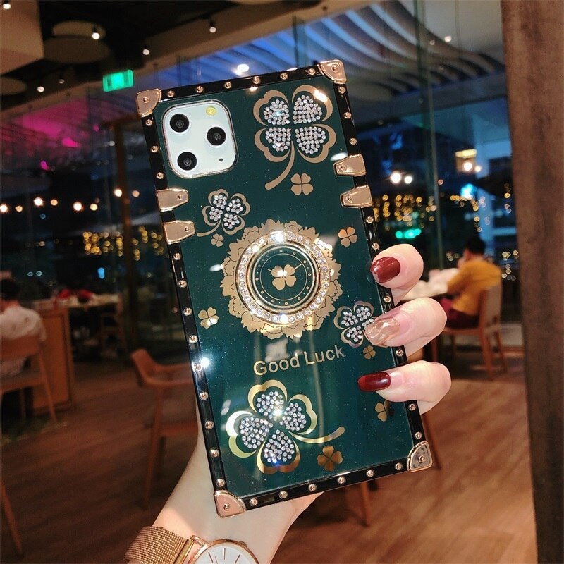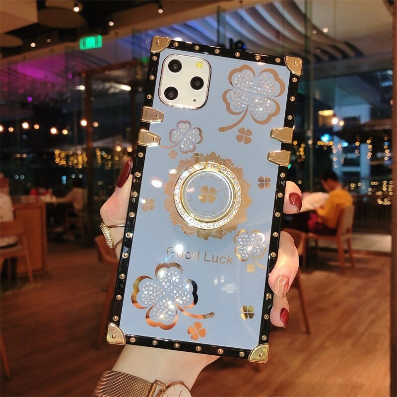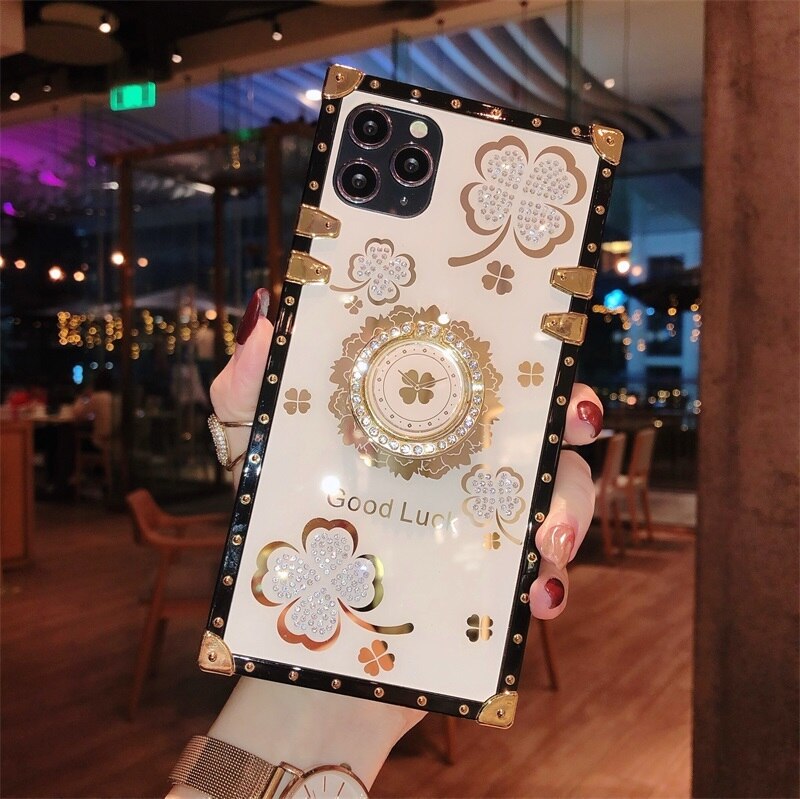 Luxury Lucky Flowers Ring Square phone Case For IPhone 16 15 14 13 12 11 Pro Max 6 S 7 8 Plus XR XS SE Diamond glitter Cover Bracket Fundas